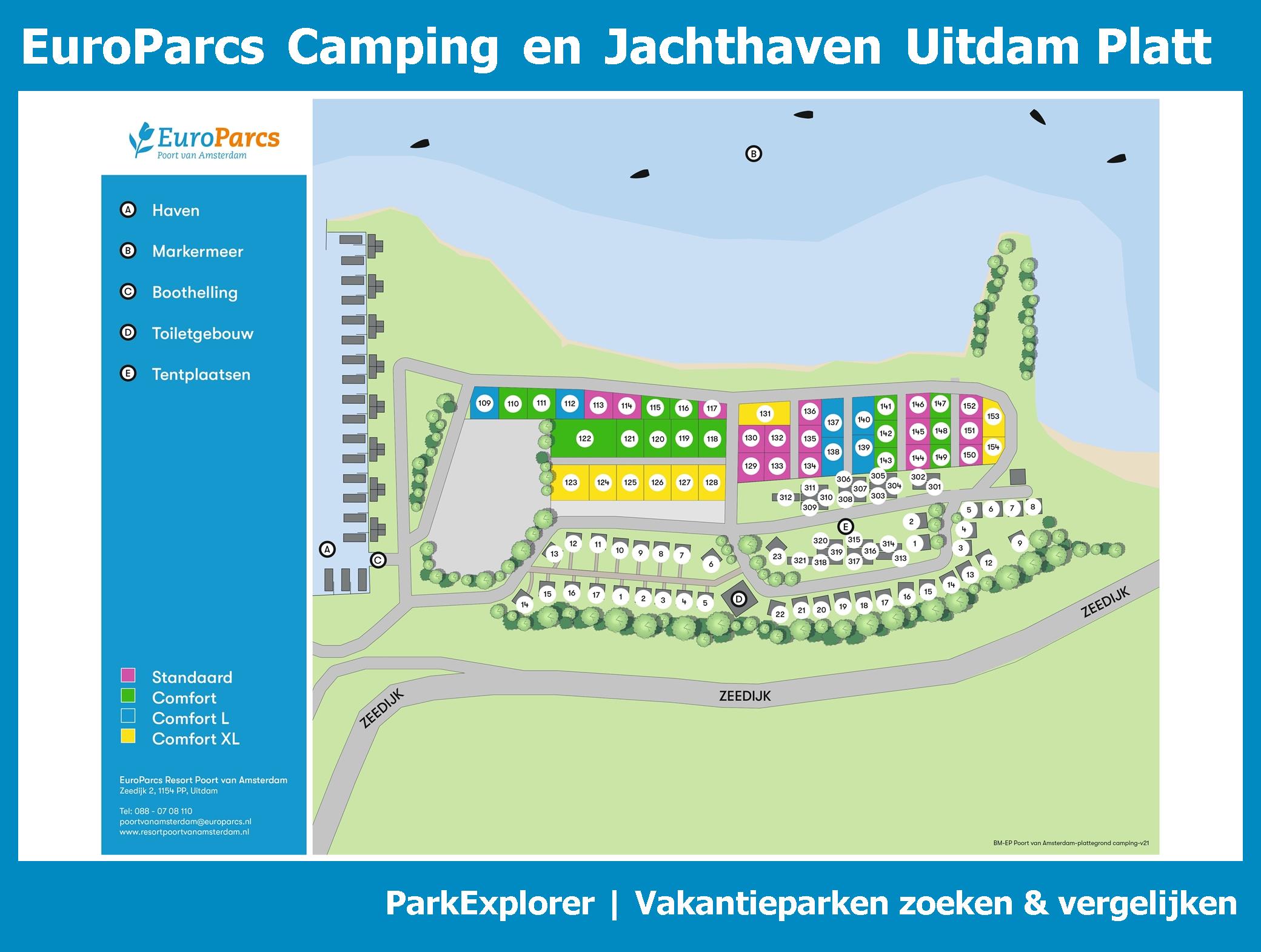 Actuele en overzichtelijke park plattegrond van EuroParcs Camping en Jachthaven Uitdam met alle huisjes en faciliteiten, ook te downloaden als PDF.