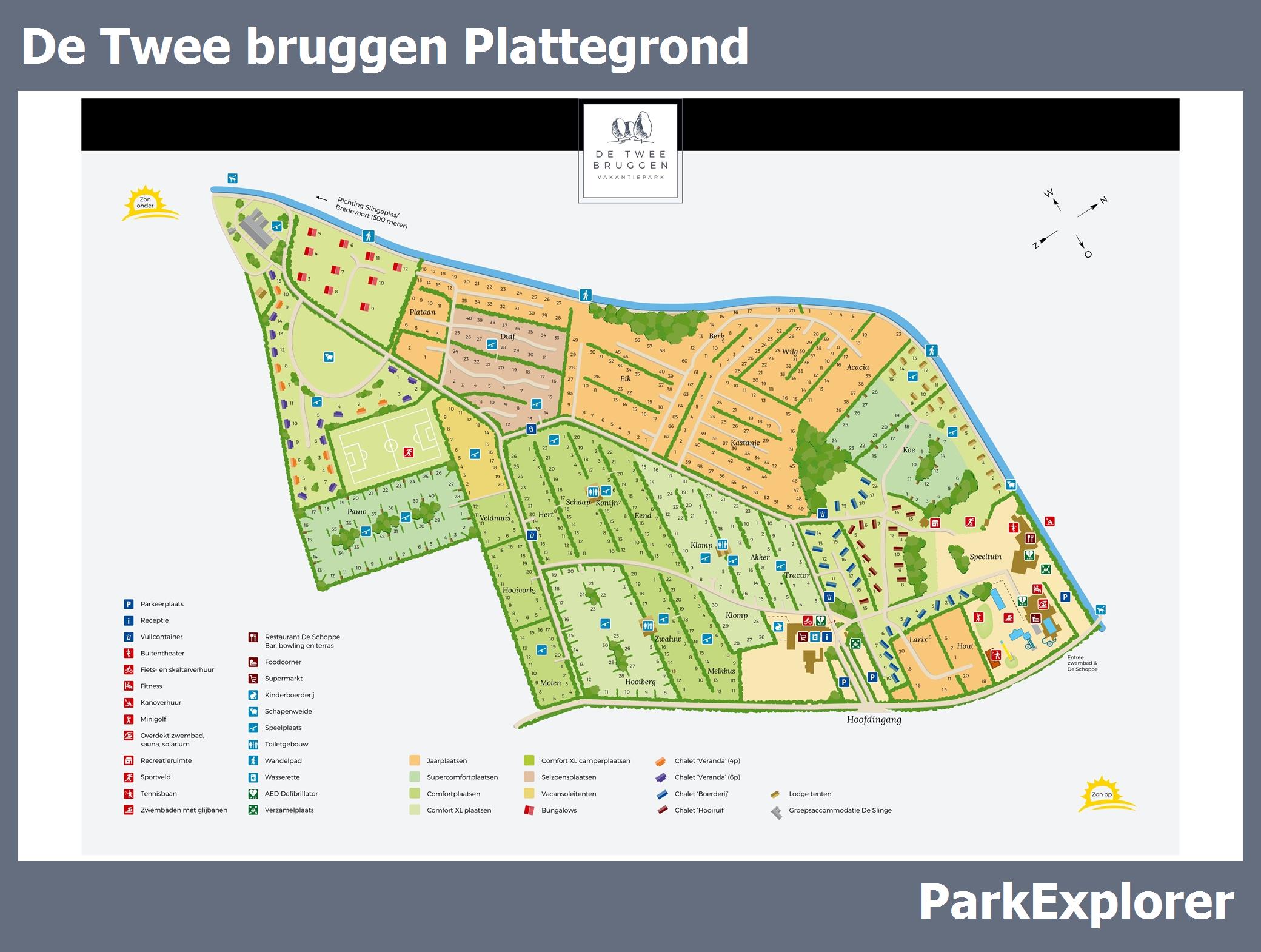 De park plattegrond van De Twee bruggen is niet alleen zeer handig tijdens het verblijf, maar vooral ook tijdens het boeken. De plattegrond geeft een goed beeld van de aanwezige faciliteiten en de ligging ervan op het park. TIP: Boek met voorkeursligging en kies een huisje in de buurt van de belangrijkste faciliteiten.