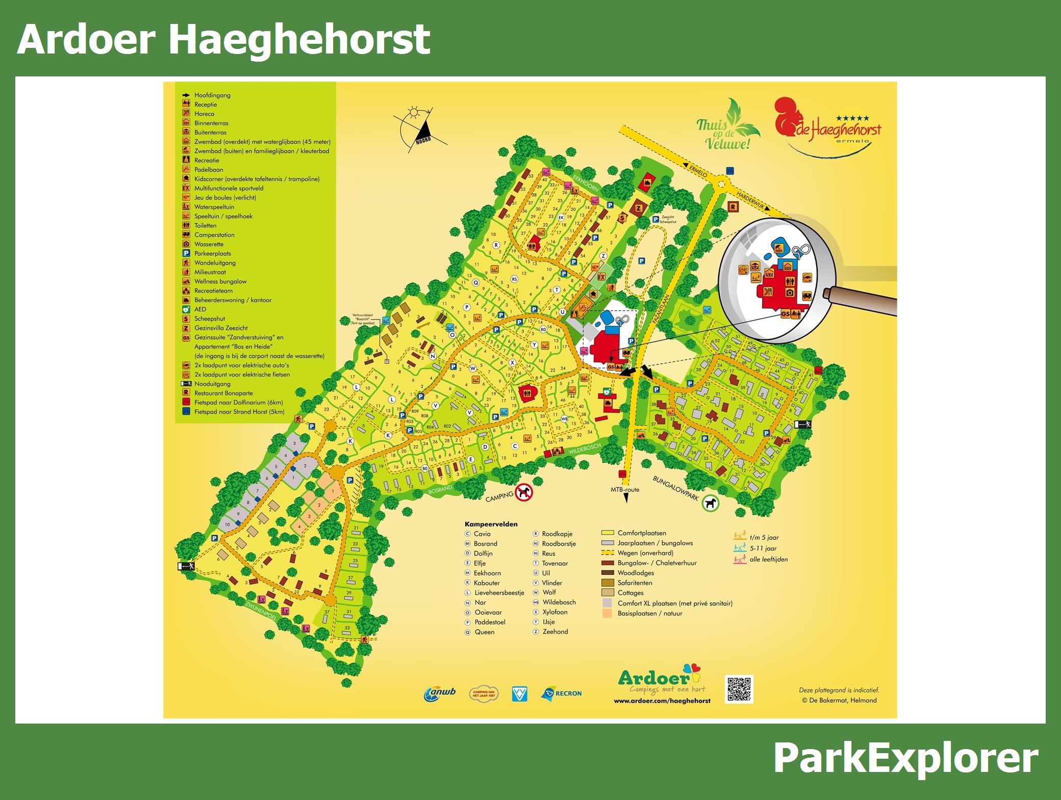 De park plattegrond van Ardoer Haeghehorst is niet alleen zeer handig tijdens het verblijf, maar vooral ook tijdens het boeken. De plattegrond geeft een goed beeld van de aanwezige faciliteiten en de ligging ervan op het park. TIP: Boek met voorkeursligging en kies een huisje in de buurt van de belangrijkste faciliteiten.