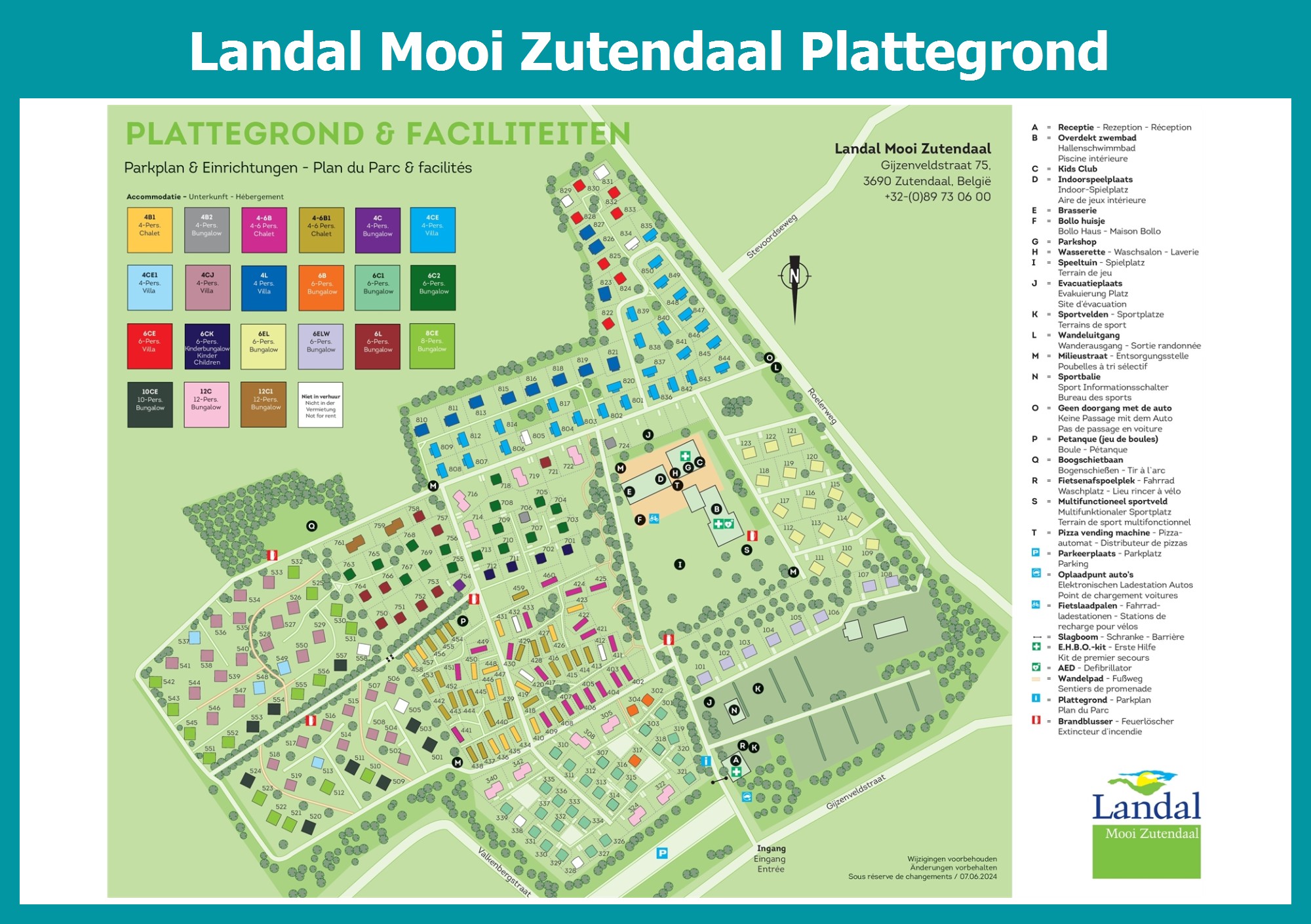 Actuele en overzichtelijke park plattegrond van Landal Mooi Zutendaal met alle huisjes en faciliteiten, ook te downloaden als PDF.