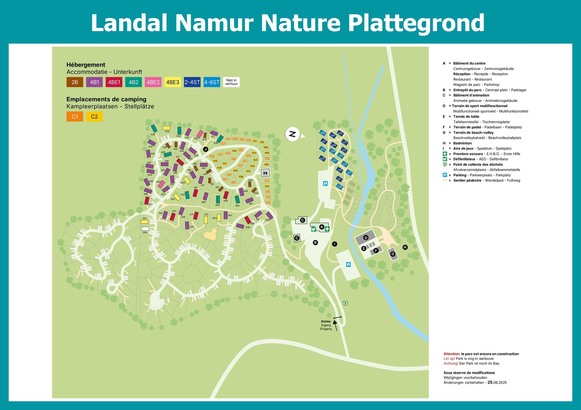 Actuele en overzichtelijke park plattegrond van Landal Namur Nature met alle huisjes en faciliteiten, ook te downloaden als PDF.