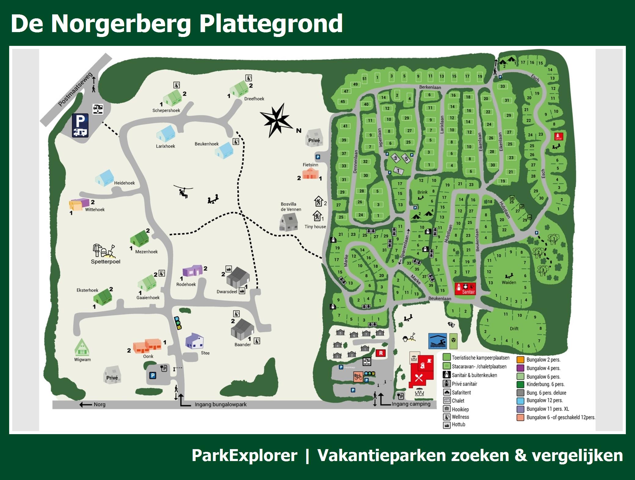 De park plattegrond van De Norgerberg is niet alleen zeer handig tijdens het verblijf, maar vooral ook tijdens het boeken. De plattegrond geeft een goed beeld van de aanwezige faciliteiten en de ligging ervan op het park. TIP: Boek met voorkeursligging en kies een huisje in de buurt van de belangrijkste faciliteiten.