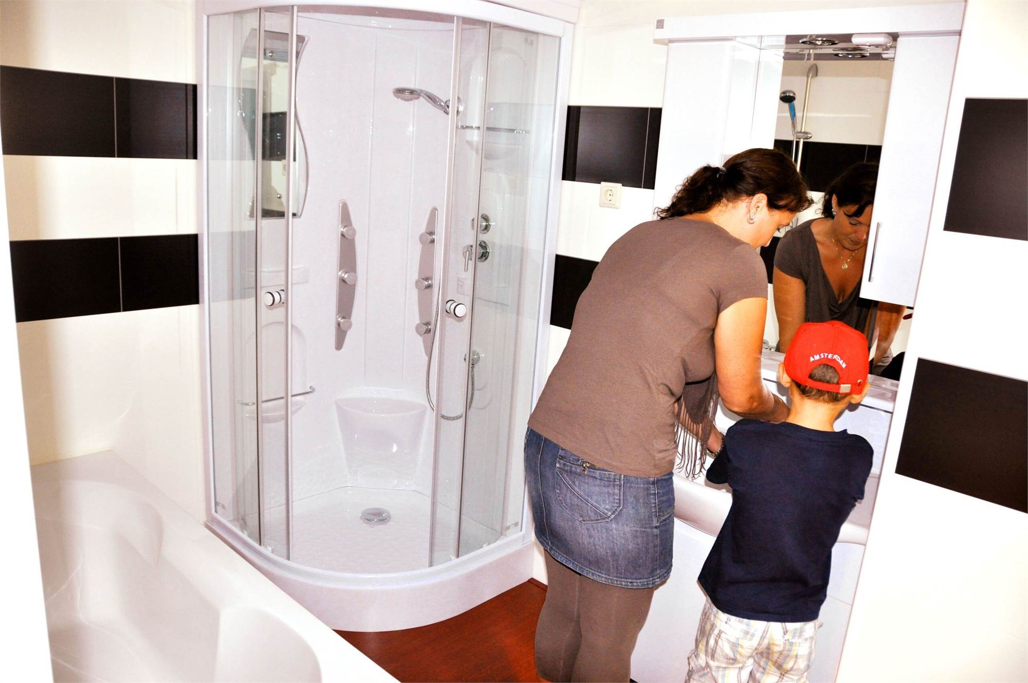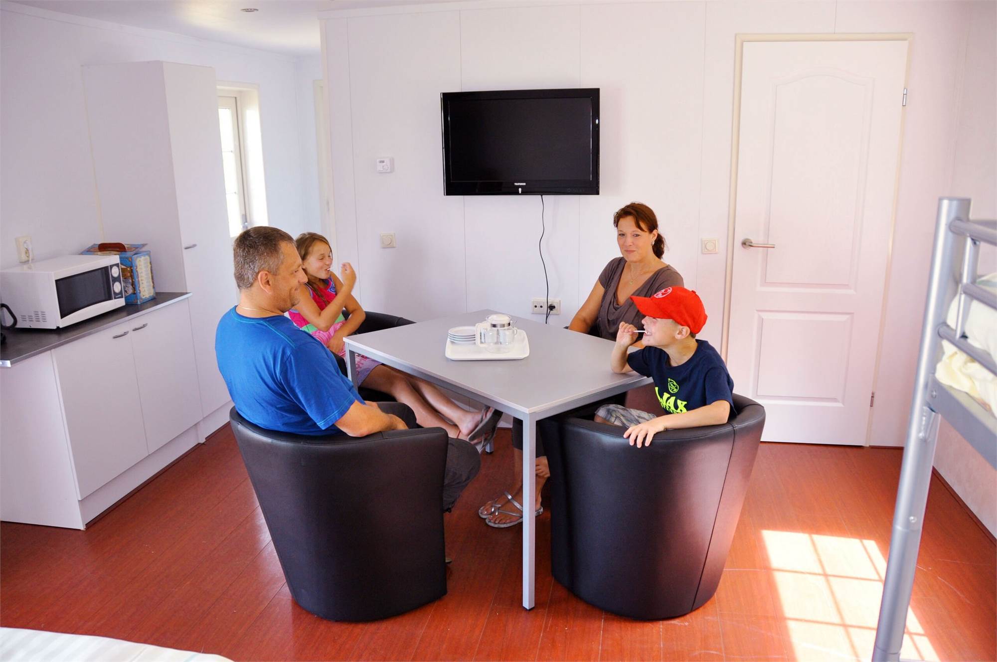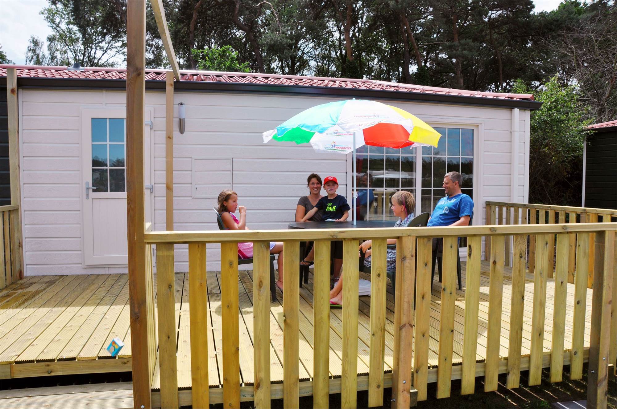 Je eigen luxe hotelkamer op de camping. Een chalet, geheel ingericht als hotelkamer! Het Camping Hotel is voorzien van een boxspringbed, flatscreen TV, badkamer met bad, massagedouche en toilet, keuken met koelkast en Senseo koffiezetapparaat. Plus een mooie veranda met complete tuinset en ‘Oostappen Groep’ parasol. In deze accommodaties beleef jij een extra comfortabele vakantie. Let op: de woon- en slaapkamer bevinden zich in dezelfde ruimte.