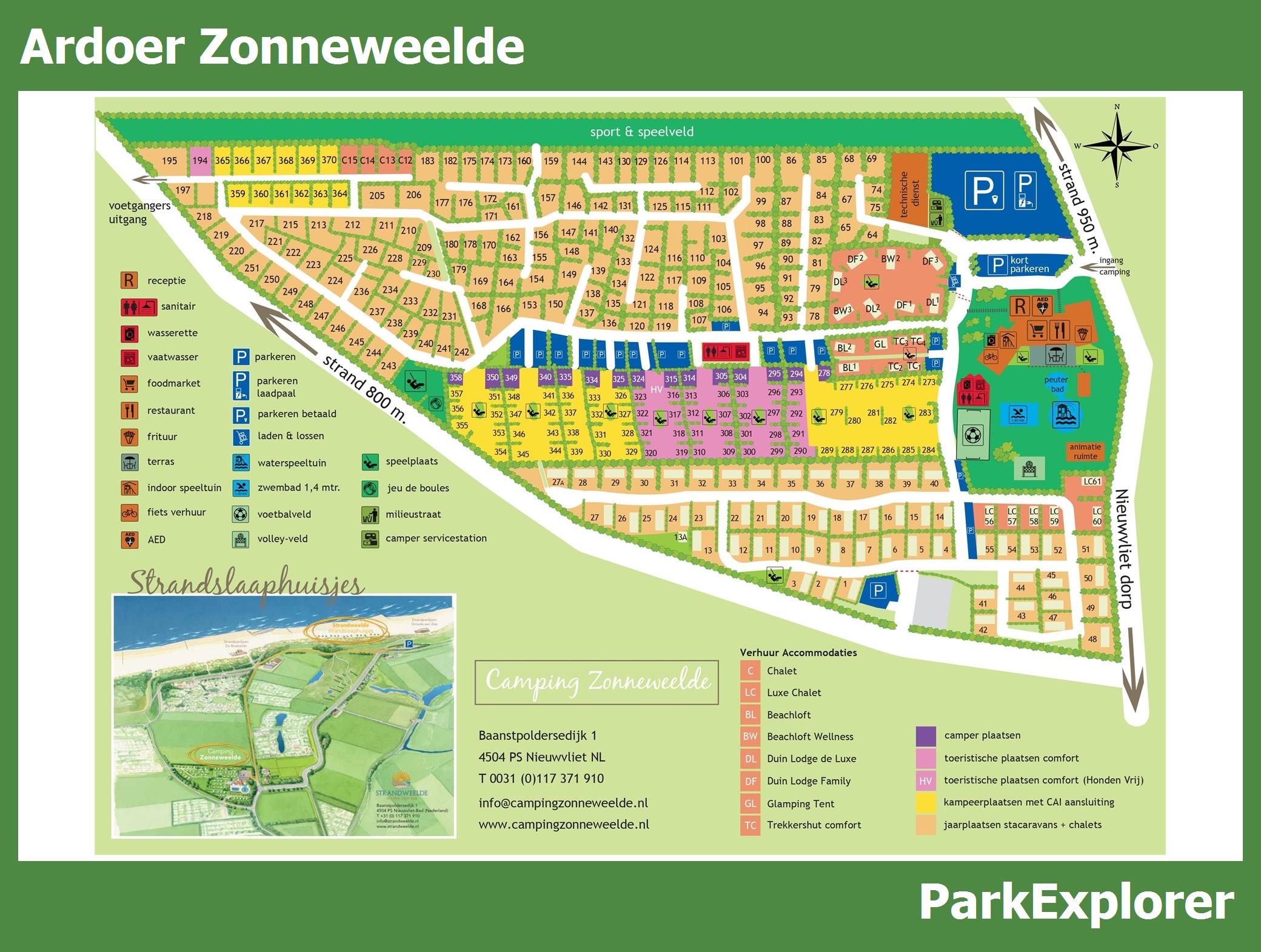 Actuele en overzichtelijke park plattegrond van Ardoer Zonneweelde met alle huisjes en faciliteiten, ook te downloaden als PDF.